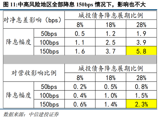 A:不会。在更合理的缓期假定下,仅有个别弱区域低等第平台有降息缓期的可能。凭据测算,即使占比28%的中高风险地区城投债务沿途降息150bps,也仅影响上市银行净息差5.8bps阁下,影响营收约1325亿元,占2022年营收比例仅2.3%。