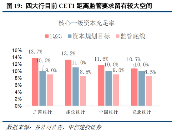 其次,现在银行业中枢一级成本足够率均较监管红线有一定距离。央行在二季度例会中也明确暗示“解救银行补充成本”,在不发生系统性风险危境的情况下,上市银行得志成本足够率底线压力不大。以四大行径例,为止1Q23,工行、建行、中行、农行中枢一级成本足够率别离为13.7%、13.2%、11.6%、10.7%,别离高于自身成本策动主见3.7、2.2、1.6、0.7pct,高于监管要求4.7、4.7、2.6、2.2pct。在2022年疫情时代,我国银行业经营濒临较大压力,但也保捏了相识的分成。现在经济复苏的大逻辑理解,银行经营环境将稳步向好,分成保捏相识的条件愈加足够。