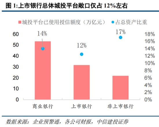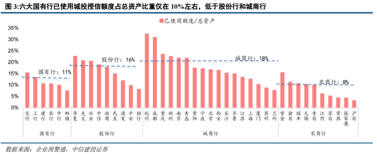图表:六大国有行已使用城投授信额度占总资产比重仅在10%阁下,低于股份行和城商行