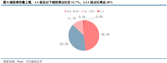 图表:城投债存量上看,AA级及以下城投债占比仅12.7%,AAA级占比高达48%